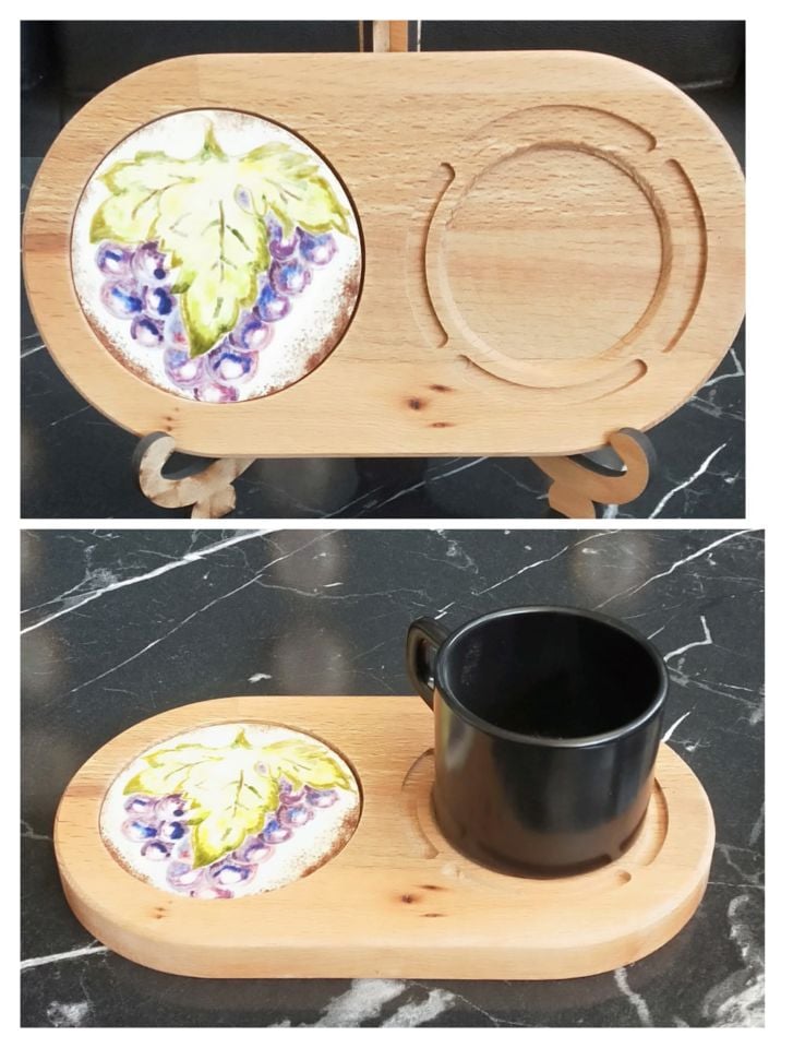 Ahşap Masif İçerisine Oturtulmuş 9.5 cm El Dekoru Seramikli Kahve Sunumluk. Masif Ahşap 23.5 x 13 Cm.